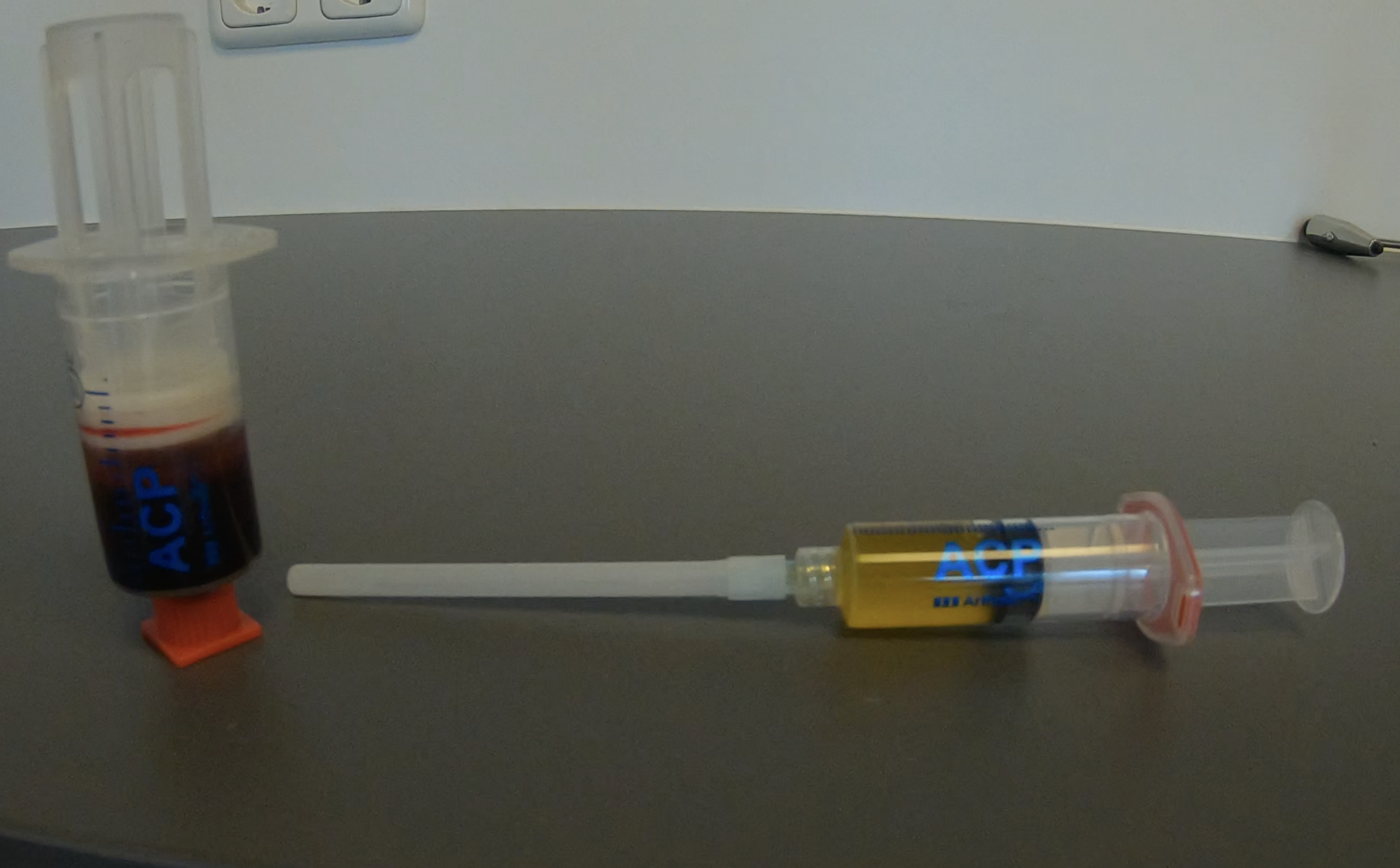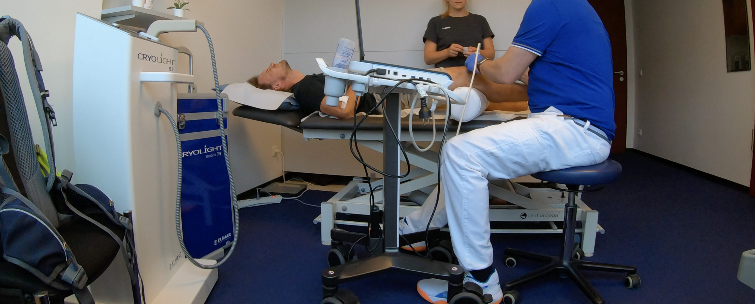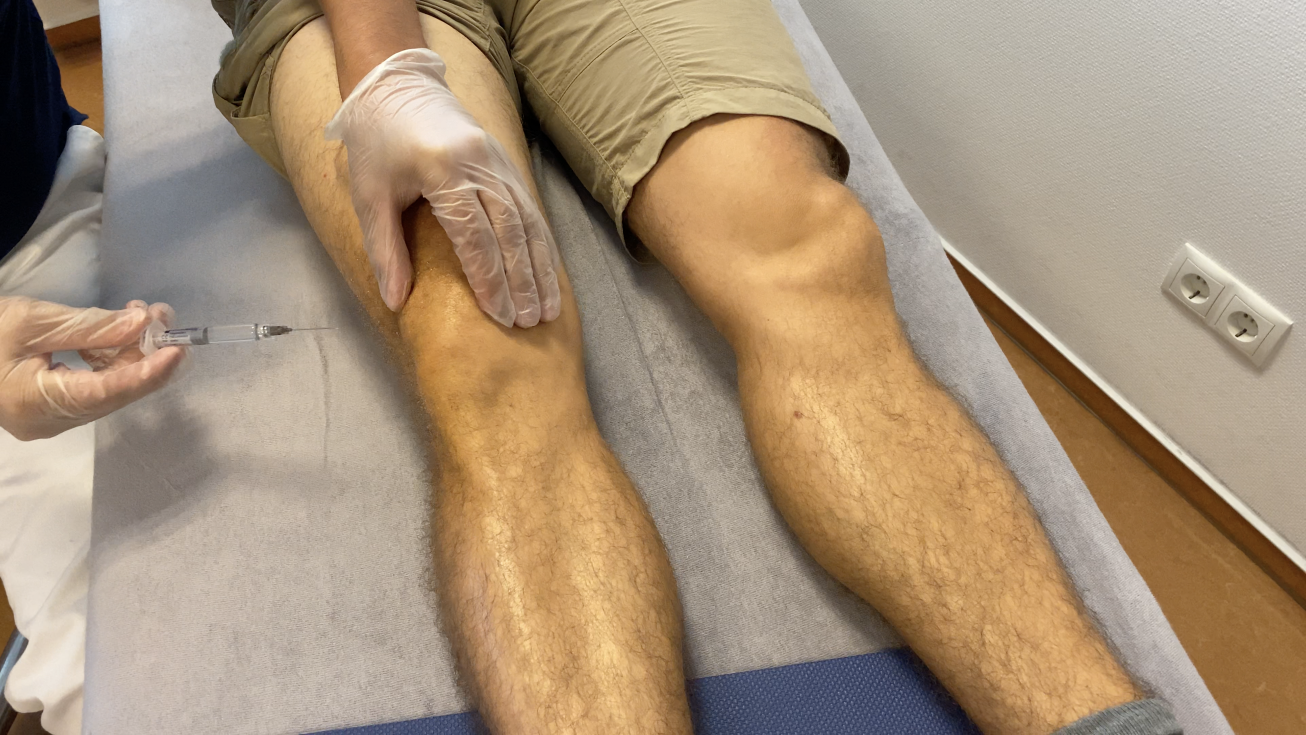 Dann wurde Blut am Arm abgenommen, um es 5 Minuten später unter Ultraschall in das Kniegelenk, in die Sehne, zu spritzen.